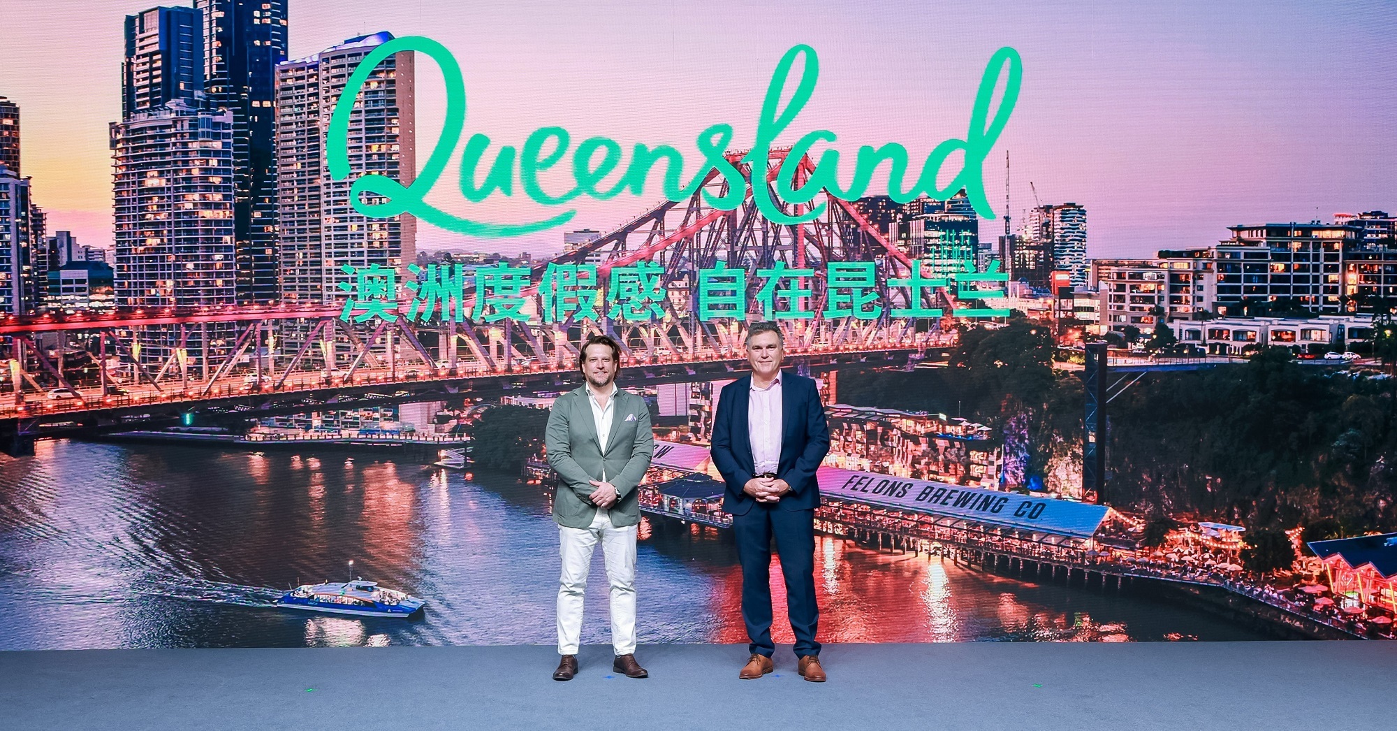 昆士兰旅游及活动推广局首席执行官戴睿德(右)与商务与合作部执行总裁欧礼文(左)共同揭晓新品牌。 受访者 供图